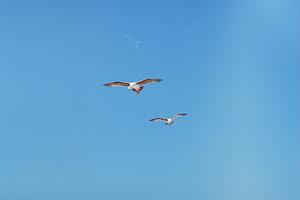 35mm film shot of 2 seagulls flying over a beach in Santa Cruz.